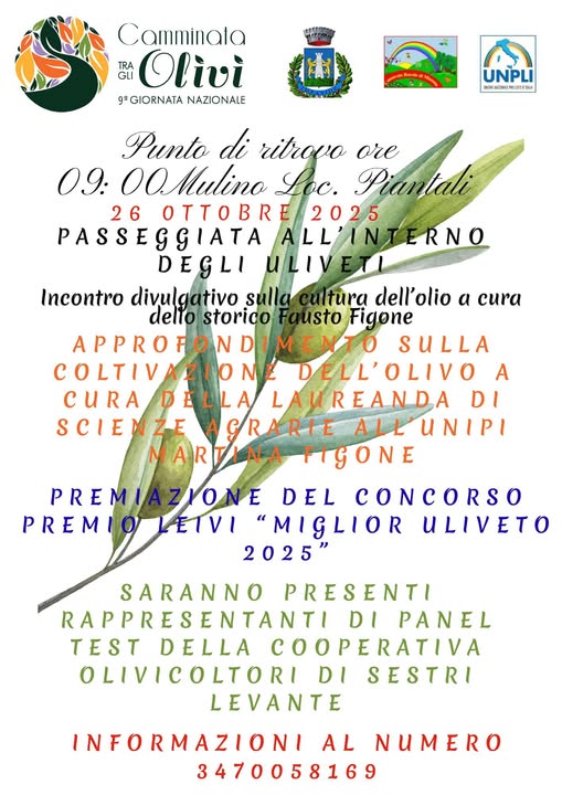 Domenica 26 ottobre, anche Castiglione Chiavarese aderisce, in qualità di città dell’olio, alla IX edizione della giornata nazionale “Camminata tra gli olivi”.